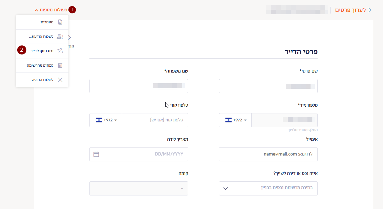 לחצו על "פעולות נוספות" -> "נכס נוסף לדייר".