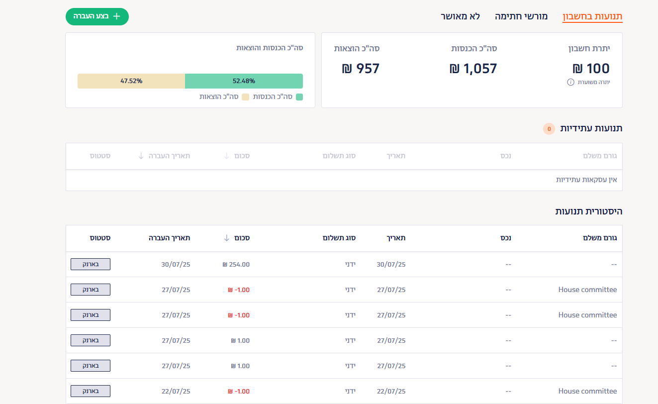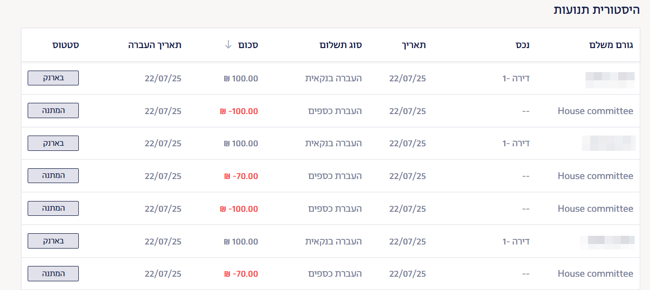 העברה לחשבון ועד הבית: יופיע בתור 'העברה בנקאית', את הכסף תוכלו לראות בחשבון הוועד עד 48 שעות מרגע ביצוע ההעברה.