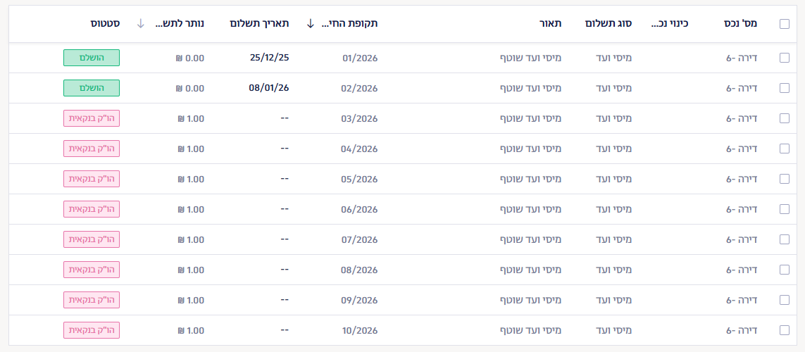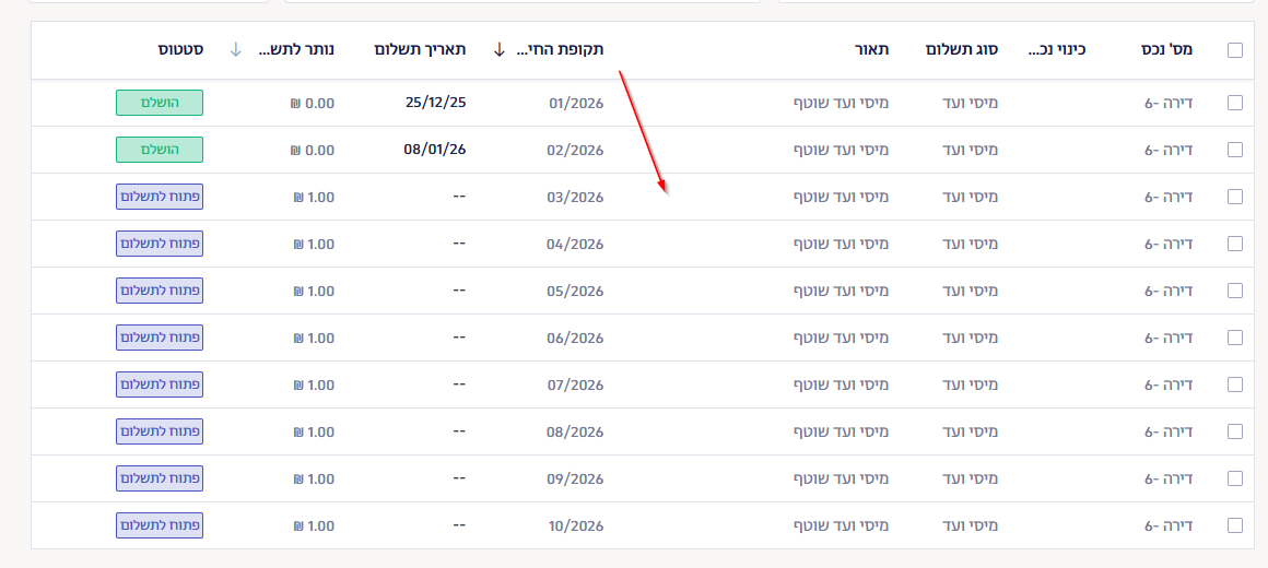 לדוגמא : דירה 3, לפי סוג התשלום 'מיסי ועד'.