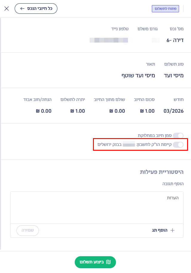 חלון צדדי ייפתח עם פרטי התשלום, גללו למטה ולחצו על האפשרות "קיימת הו"ק לחשבון: XXXX בבנק ירושלים"