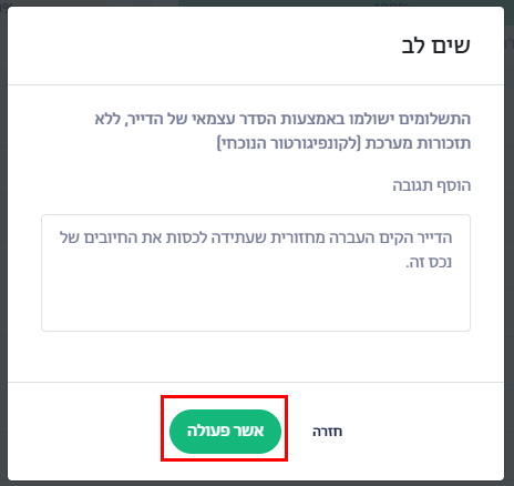 המערכת תפסיק לשלוח התראות לדייר בגין חיוב זה מכיוון שעתידה להגיע העברה שתסגור את החיובים של הגדרת תשלום זו.