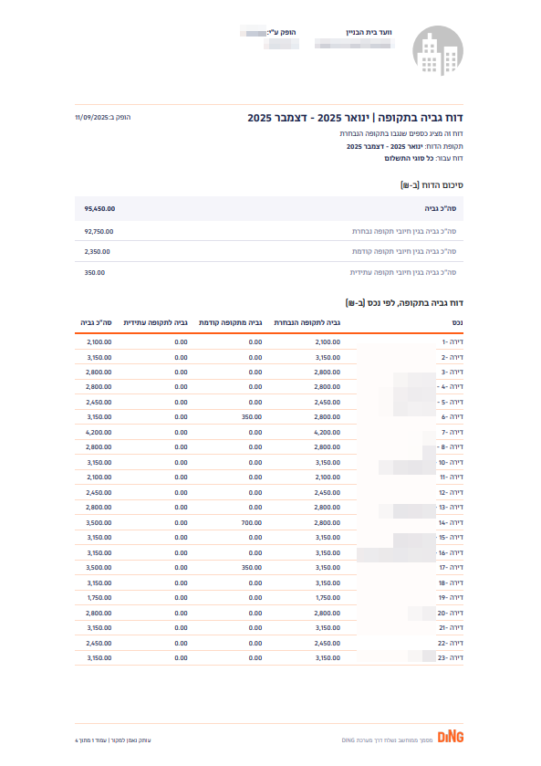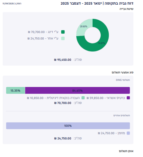 הדו"ח יציג את סך כל הסכומים שנגבו, תוך חלוקה לפי אמצעי הגבייה – גבייה באמצעות DING לעומת גבייה ידנית.