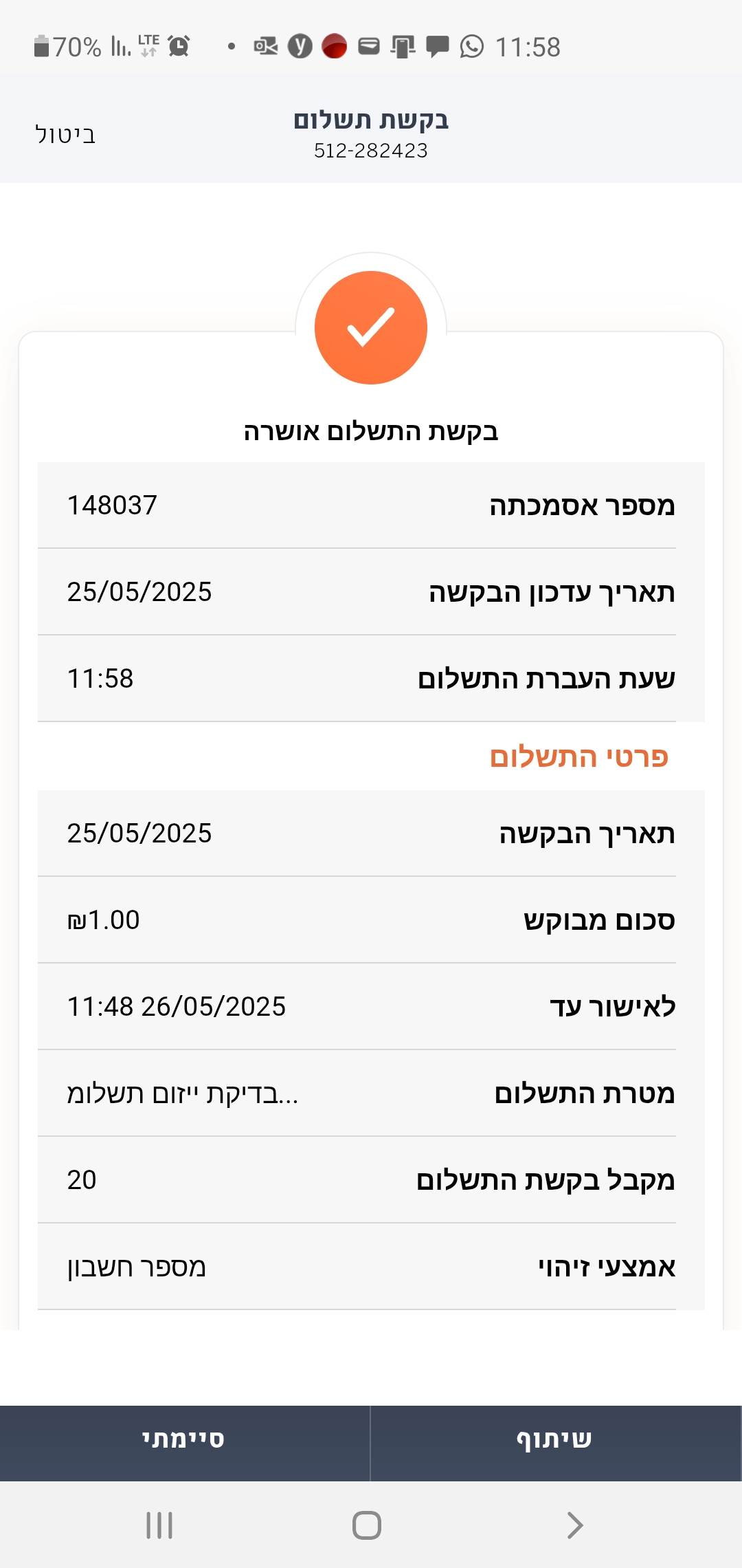 לאחר הזנת הקוד, תועברו למסך המסכם את פרטי 'בקשת התשלום', קראו את הסיכום ולאחר מכן לחצו על 'סיימתי' .