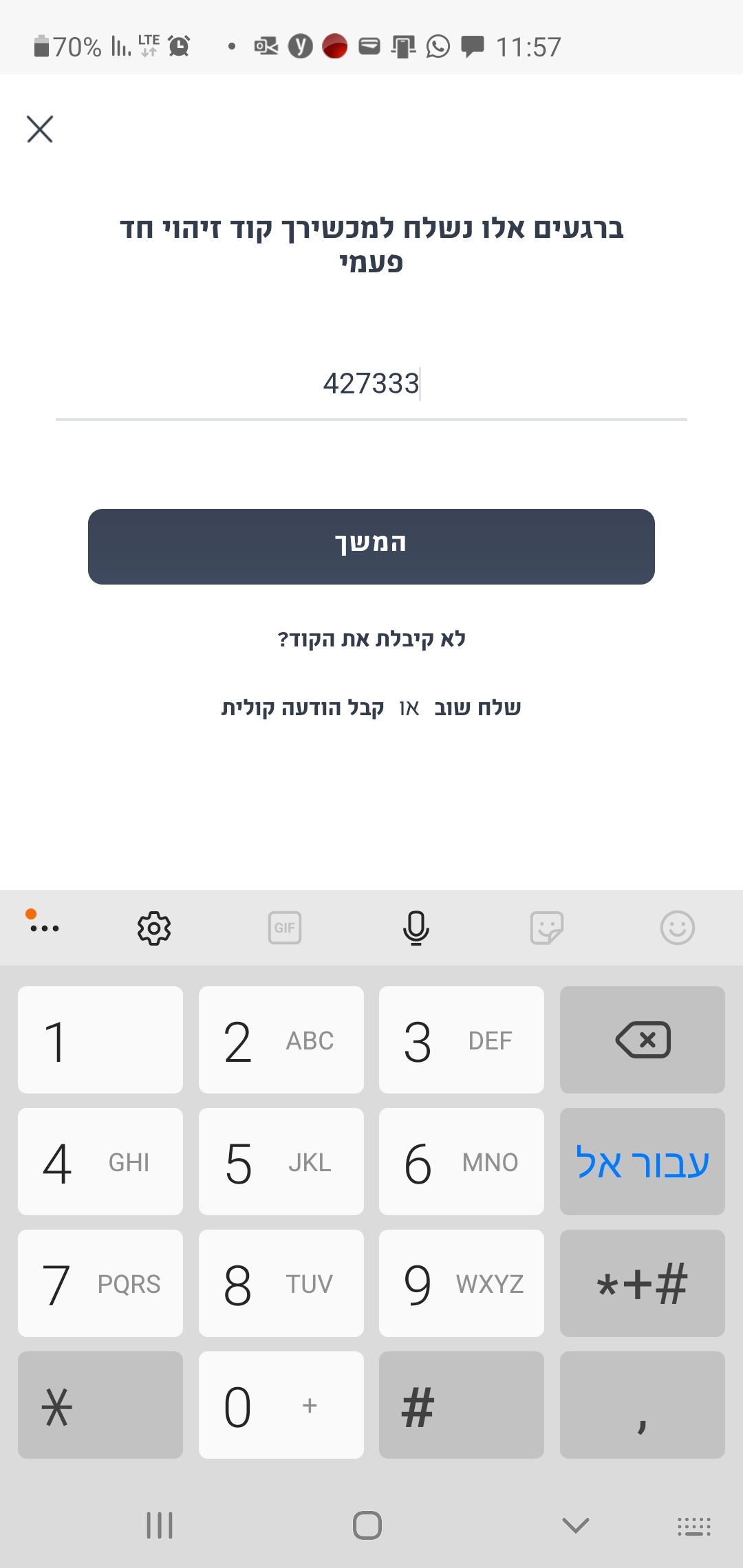 הזינו את הקוד שקיבלתם ב SMS / בשיחה בתוך השדה המיועד.